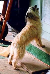 Mocha de La Brise ptd. "Mocha" (CH. Mistry's Willy de La Brise x CH. Urrugne de l'Estaube) ![]() Mocha is a very sweet and incredibly smart girl with excellent herding instinct,very correct coat, beautiful let-down of hock, and a very nice smile. She has acceptible natural ears, but they should probably have been cropped. Mocha was not shown very much, but won a 3-point major toward her championship. She is now retired and living in Tubac, AZ with Jean Titilah & Emilio Falco