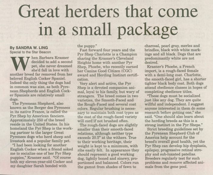 Phoebe, Charlotte & Sarah Sagette du Val Soannan CGC/HIC & CH Kaya de La Brise in the news with owners Sarah Morrison & Barbara Krasner the Ashtabula, OH Star Beacon, Sunday May 4, 2003 ![]() ![]() |