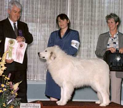 Majesta's French Monet "Mona" (CH. Beau Pierrot de La Brise CGC x CH. Majesta Life's Little Joy) ![]() "Mona" has a gorgeous head in the best French tradition. At the 2001 Great Pyrenees Club of America National Specialty, Belgian breed expert, Henri Remy agreed! He awarded her Best in Sweeps over 70 plus pups. Although her movement is also very impressive, it was her excellence of head & expression that got her the win. Mona is co-owned with her breeder, Faye Ragland of Majesta Pyrs in WV. "Mona" a gagne meilleur jeune chien (age de 6-18 mois) a la Nationale d'Elevage USA en 2001 sous juge Belge M. Henri Remy. Elle a d'excellents allures, mais c'etait surtout sa tete et expression que l'a sorti