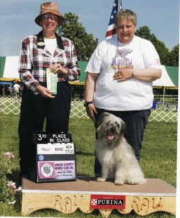 | Deb & Alex are the #1 Pyr Shep versatility team in the country and possibly the world! Following in the steps of his VP3 father, Alex earned his CH, CD and RAE, and has now surpassed him, becoming the first Pyr Shep to gain the coveted title of VCD1, and now the VCD2. The VCD titles are earned from combining tracking, obedience and agility titles. Alex & Deb have stunned the Pyr Shep community with not only the extent of their achievement but the rapidity with which they are racking up titles! Alex now has a little "sister" named "Fiona" (Clipper x Katie)! No doubt we will soon hear great things from her too! |